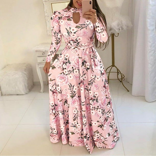 Bescita Women Summer Dresses Clearance Women S Long Sleeve Bandage Print Dress O Neck Button Down Casual Long Dress Pink 12 Xl Walmart Com
